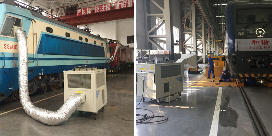 冬夏工业冷气机 SAC-250 除适配列车检修基地、铁路机车维保车间等轨道交通检修场景外,还广泛适用于大型厂房、机械制造车间、仓储分拣中心、设备检修工位等各类空间大、通风差、需局部降温的工业高温作业场景。
