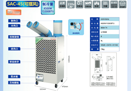 冬夏 SAC-45 作为工业级移动冷气机,4500w/15300BTU制冷量、850m³/h 大风量,可实现开机快速降温,局部冷风口可达到10-15℃的温差,根据工人岗位可进行75°左右自动摆风,单台设备能高效覆盖车间关键岗位与高温区域,解决神龙汽车公司汽车车间等场景的局部过热问题。该设备无需复杂安装、即插即用,移动灵活的特性可适配车间动态生产布局,满足不同工位的差异化降温需求。